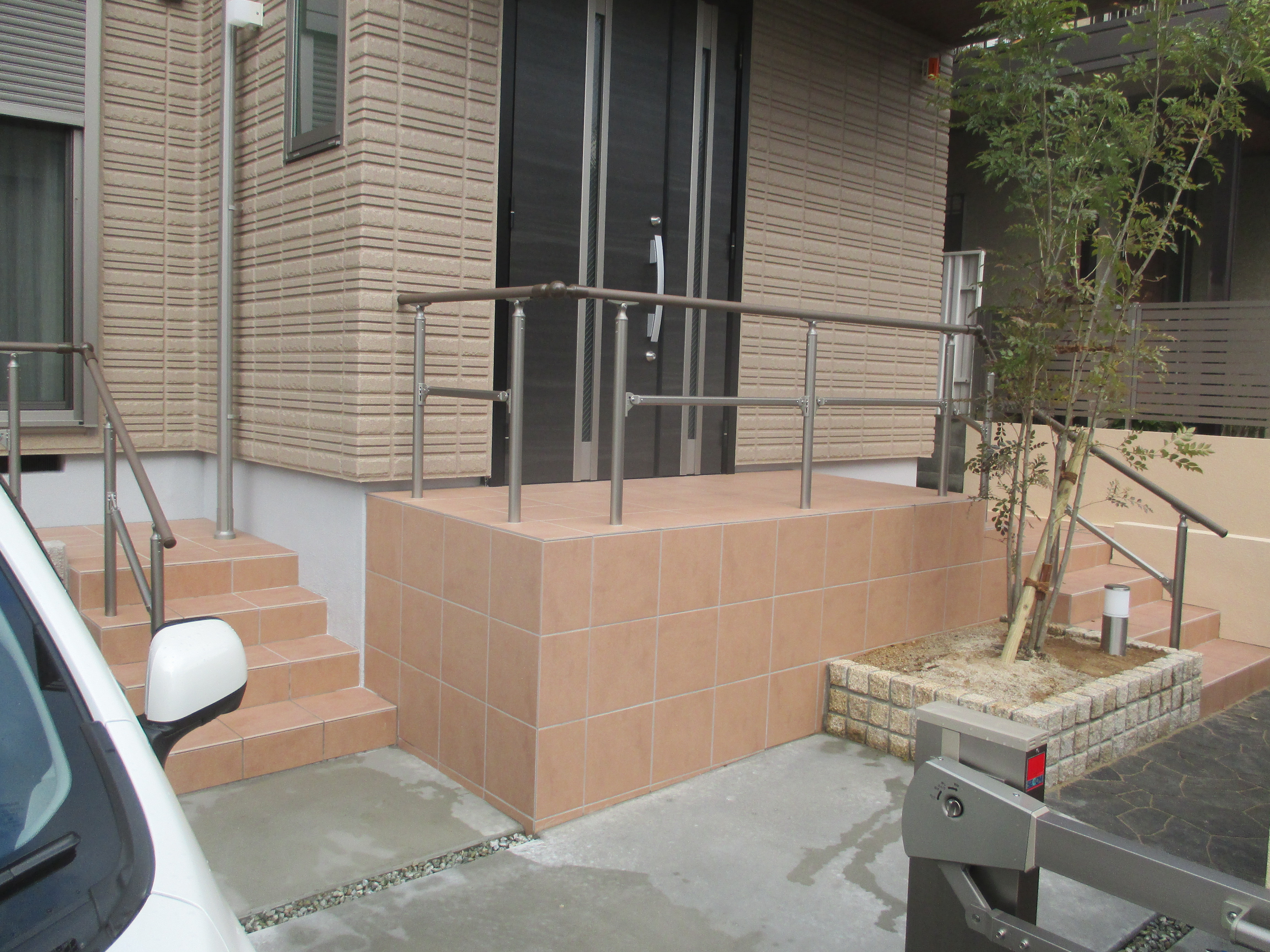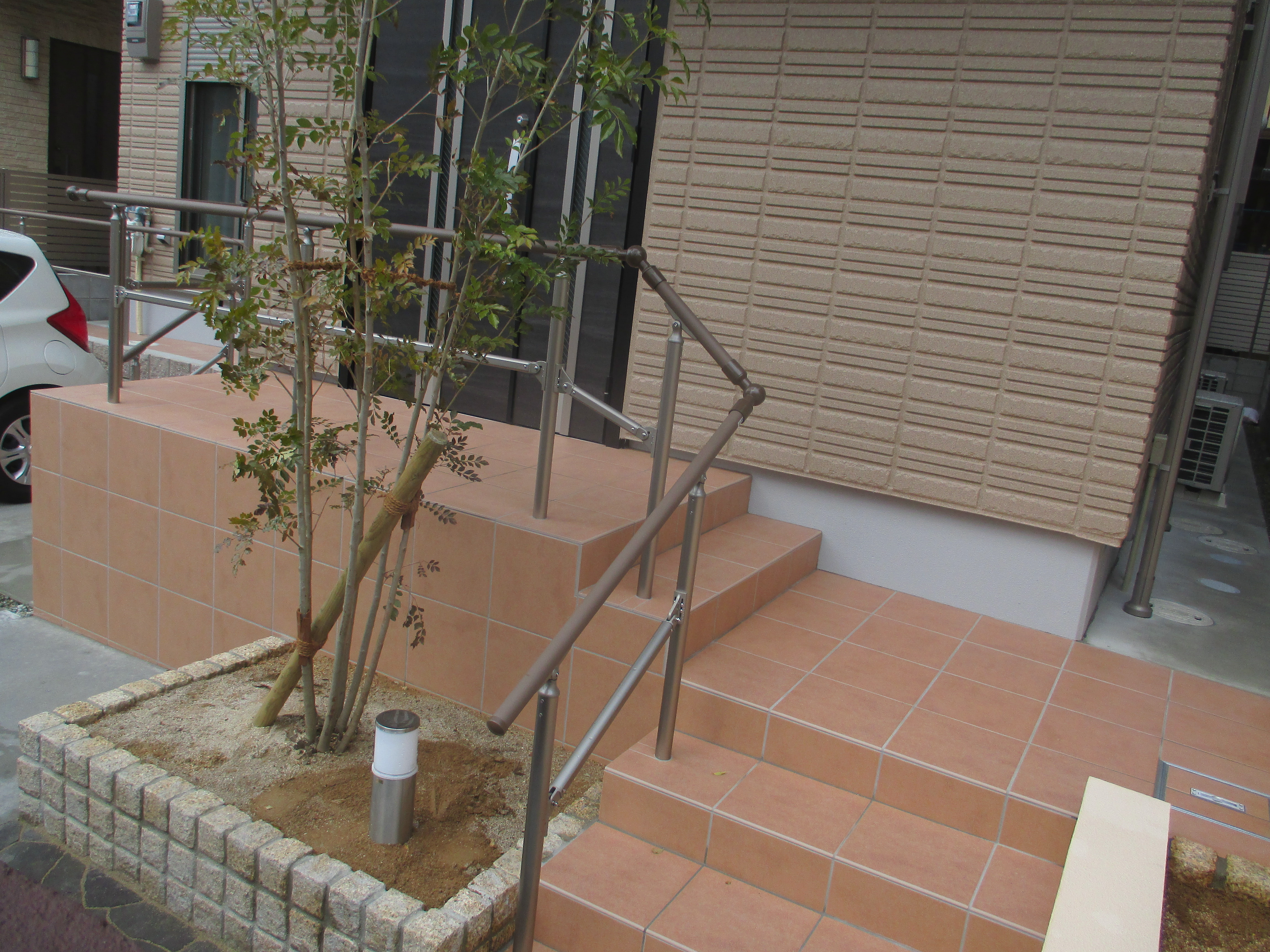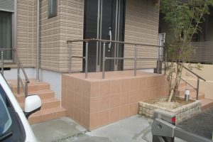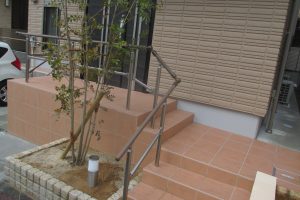 アプローチステップは高低差があるので、手摺は必須。
