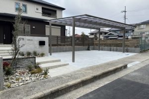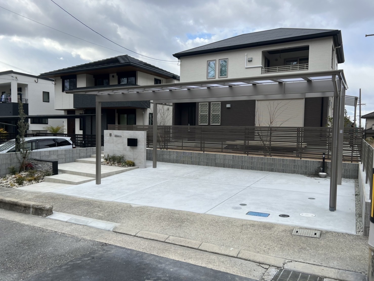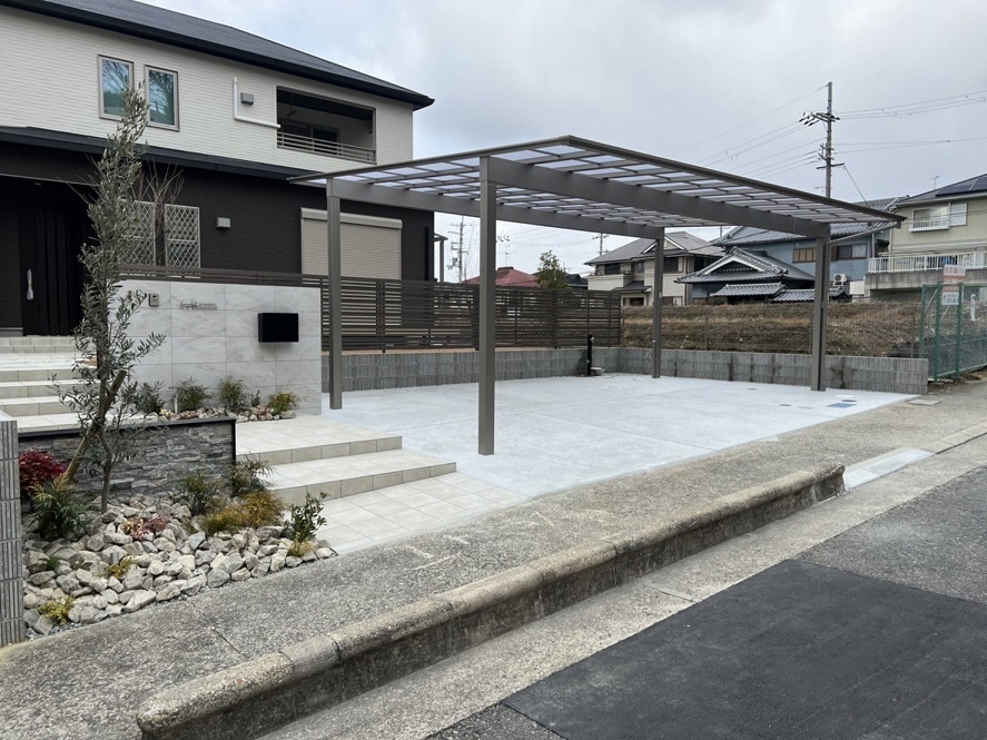 ガレージは2台用のカーポートがゆったりと構えて、ポーチ入口の植栽と後ろにある化粧タイルで装飾した門塀が、