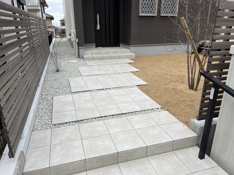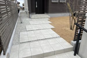 エントランスへ続くアイボリーカラータイル貼りのポーチと、ポイントに植栽を設えた上品な外構です。