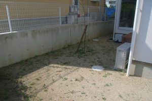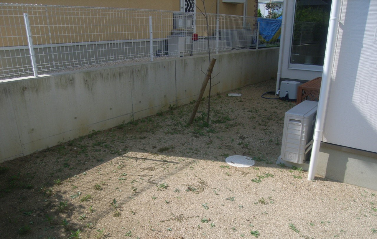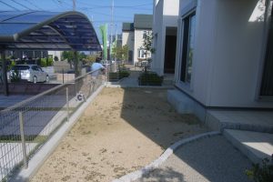 現況は真砂土と一部タイルのあるお庭です。雑草も出てますね~