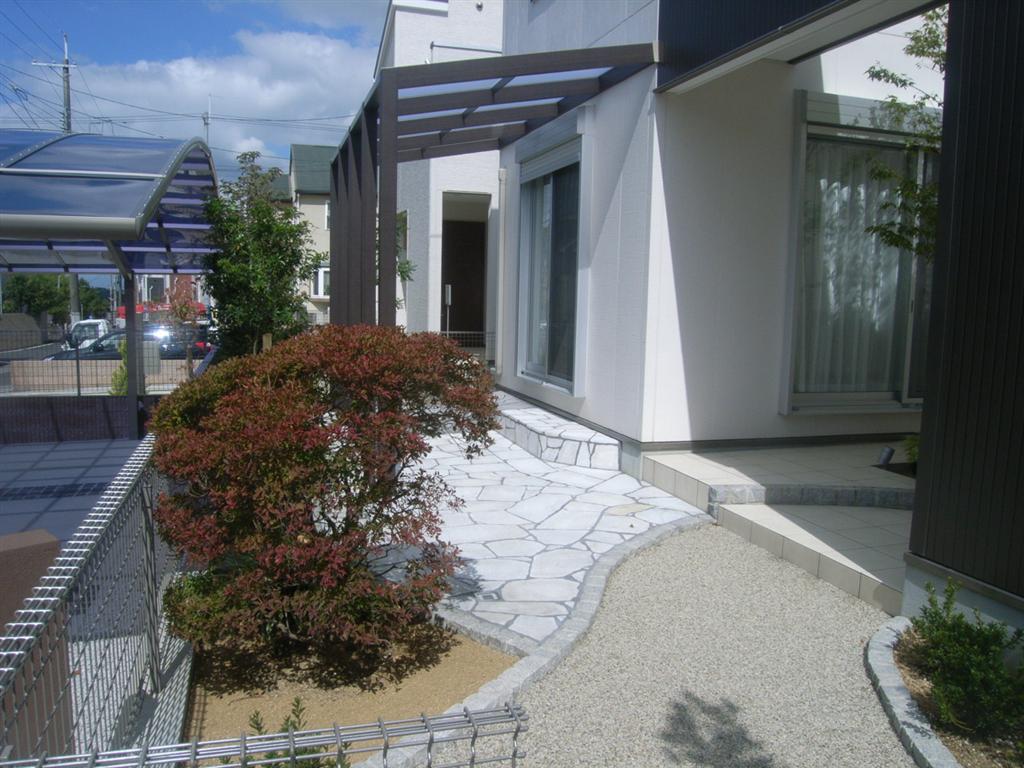 今回はアプローチ・テラスに乱形タイルを施し、お庭にもタイルに化粧砂利を施しました。